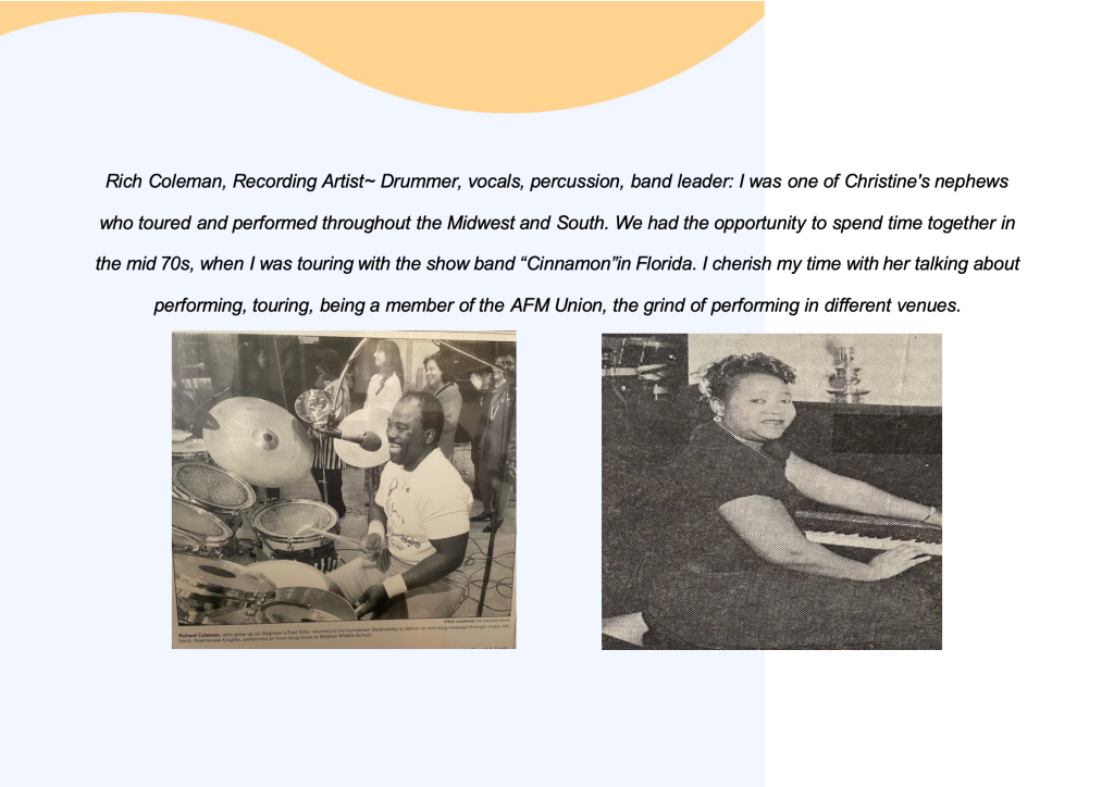Christine performed with Alan Green, the Leak Brothers, Sammy Prince, Duke Forte, Andrew Tibbs, Tommy Archia’s All Stars, Big Mabelle, Hank Ballard, Peppy Prince, Gene Ammons, Joe Liggins and the Honey Dippers, Percy Mayfield, Jack McVea, Oscar McLollie, and The Platters. Christine’s last recording is with the Walnut Grove Male Chorus, “What a Great Big God We Serve”.
